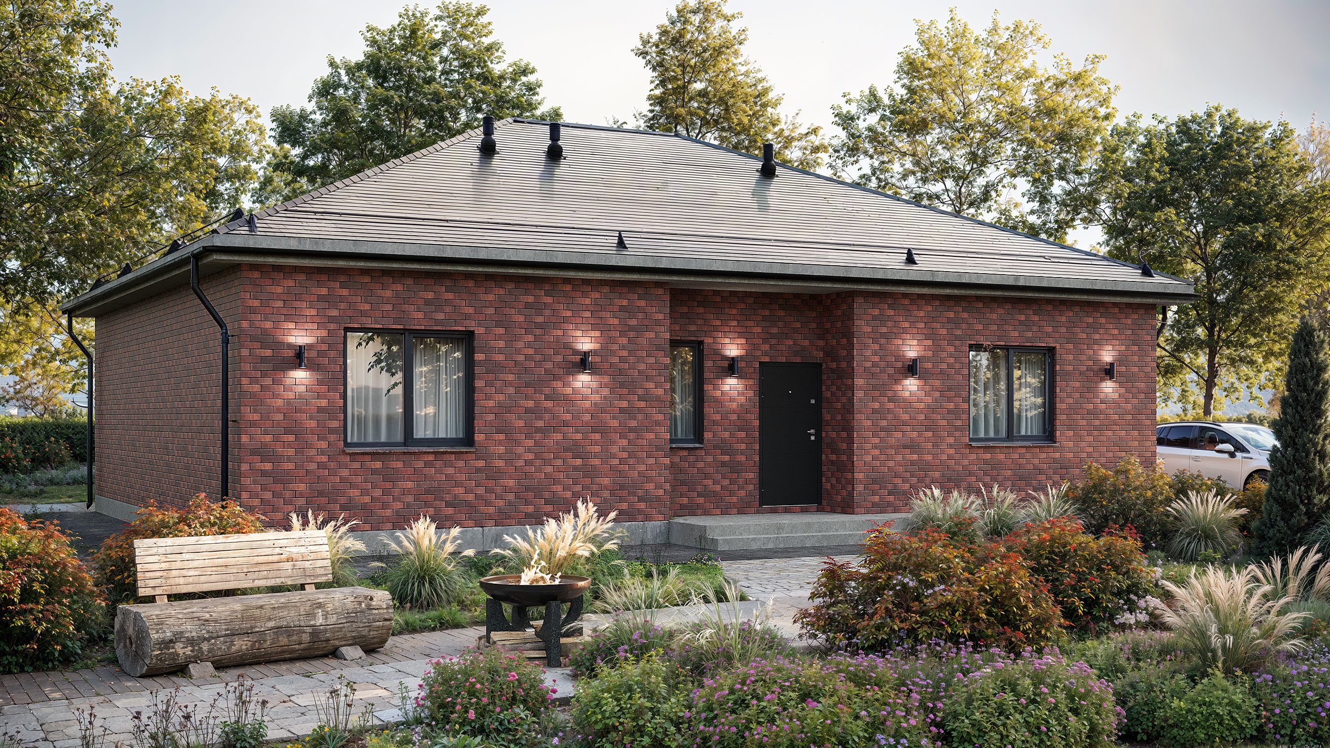 Кирпич переливается красным и оранжевым, имеет фактуру рустика. В каждом поддоне уже замиксованы разные оттенки кирпича. Это упрощает кладку и создает равномерные переходы цвета.